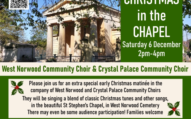 Please join us for an early Christmas matinée with West Norwood and Crystal Palace Community Choirs. The Choirs will be singing a blend of classic Christmas tunes and other songs, and the venue is the beautiful St Stephen's Chapel, West Norwood Cemetery. This will be a really unique afternoon - families most welcome - a lovely way to start the holiday celebrations.