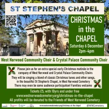 Christmas in the Chapel - a family choir concertPlease join us for an early Christmas matinée with West Norwood and Crystal Palace Community Choirs. The Choirs will be singing a blend of classic Christmas tunes and other songs, and the venue is the beautiful St Stephen's Chapel, West Norwood Cemetery. This will be a really unique afternoon - families most welcome - a lovely way to start the holiday celebrations. |