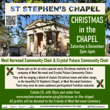 Christmas in the Chapel - a family choir concertPlease join us for an early Christmas matinée with West Norwood and Crystal Palace Community Choirs. The Choirs will be singing a blend of classic Christmas tunes and other songs, and the venue is the beautiful St Stephen's Chapel, West Norwood Cemetery. This will be a really unique afternoon - families most welcome - a lovely way to start the holiday celebrations. |